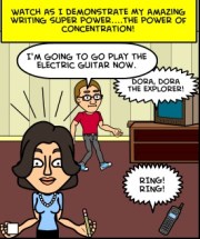 I have decided that disruption is good thing; it just proves how much super-focus power I have. Every time I return from a break, return from a break, return again from a break, I reaffirm my writing commitment, my desire to be there, my interest, the importance of what I’m doing for myself, because instead of saying ‘too heck with this, I’m going to go make myself a sandwich’, I’m saying ‘I’m going to write this novel even if I’m interrupted a million times!’.