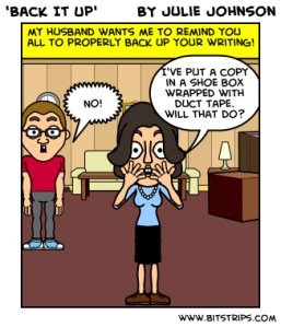 I started to panic. Oh my God! Did I have any back-up? Where was my back up? Sure, my comics have been uploaded to my hard-drive (I cut and paste them from my bitstrips.com account into my computer before uploading them to my blog)…but the writing? Ahhh! Where was the writing?